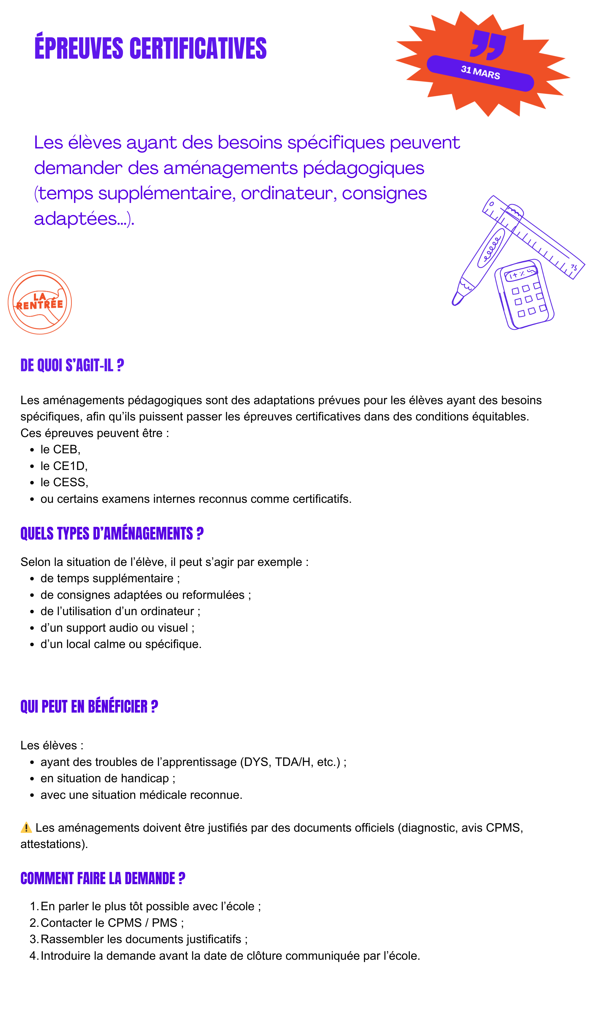 TYPES DE RECOURS : Recours contre une décision d’échec ou d’orientation – Recours contre une affectation dans une école secondaire – Recours en cas d’exclusion d’un élève – Recours pour l’allocation d’études (bourse scolaire).